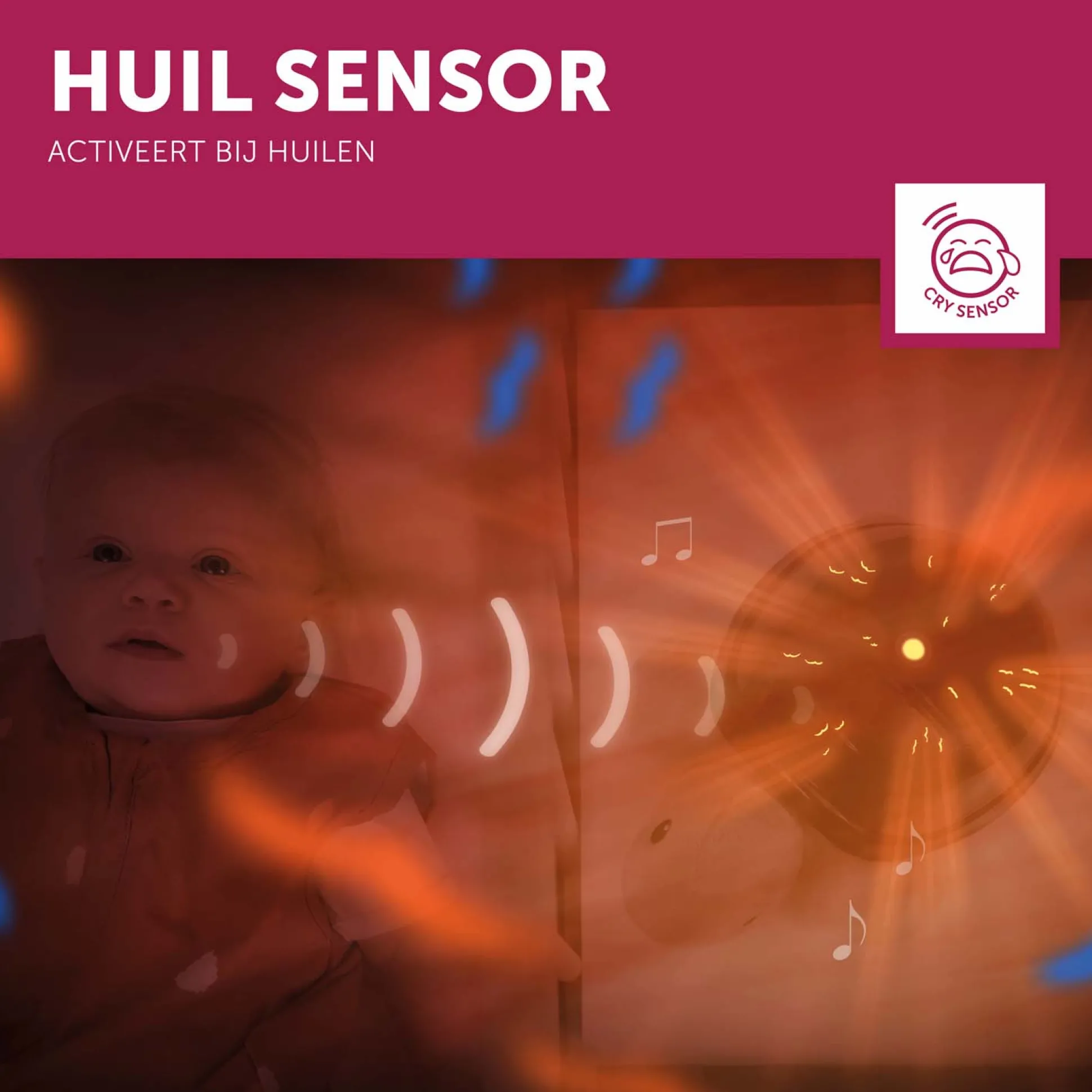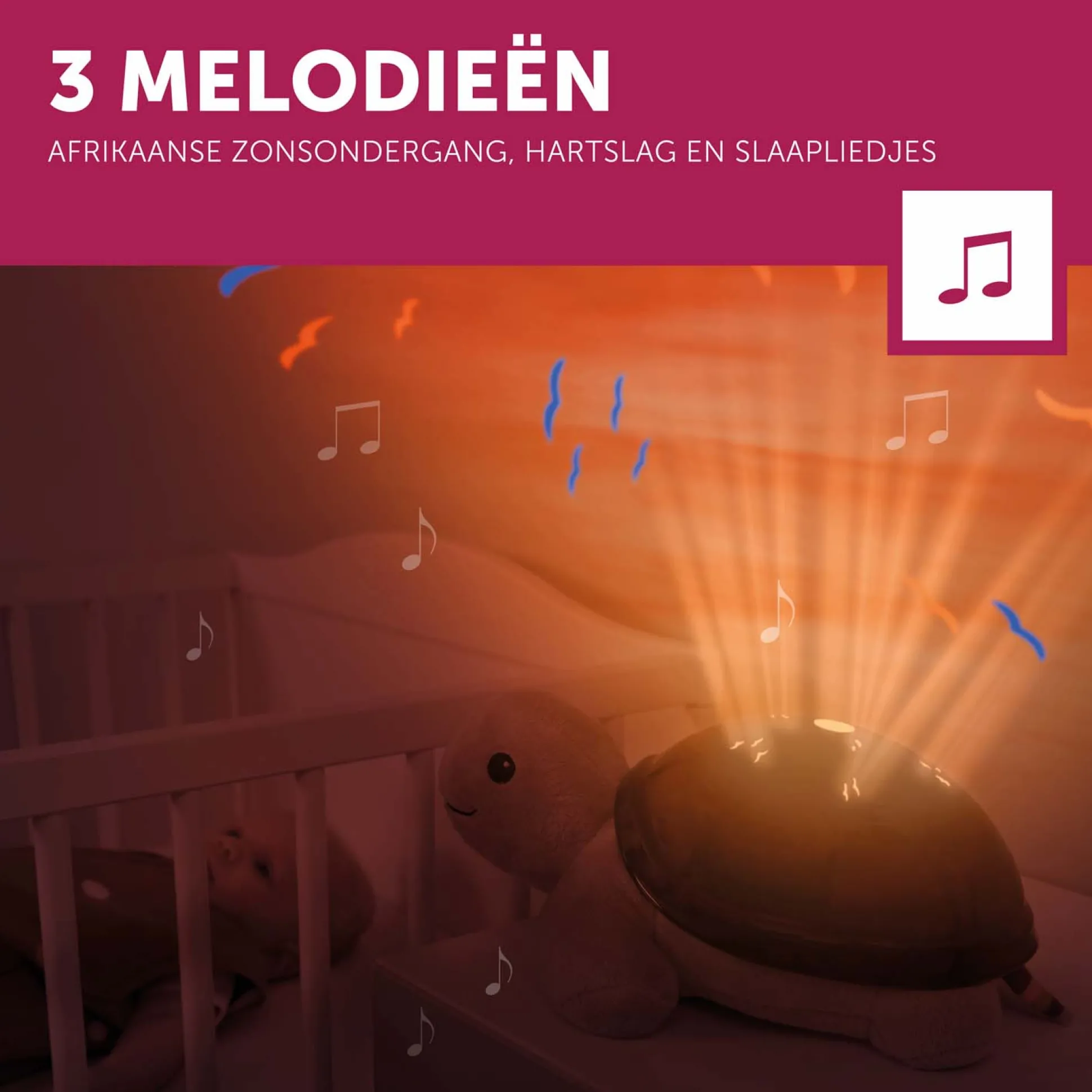 Tim de schildpad van het merk Zazu is een projector die de slaapkamer van je kindje veranderd in een prachtige zonsondergang. Tim projecteert vogels en bewegende lucht op het plafon en speelt ontspannende melodieën. De Afrikaanse natuurgeluiden, de hartslag van een moeder en diverse slaapliedjes helpen je kindje om rustig in slaap te vallen. De projector bevat een uniek 3-stappen slaapprogramma, waarbij de geluiden en helderheid van de projectie geleidelijk afneemt. Na 30 minuten schakelt de projector automatisch uit. Door de huilsensor gaat de projector automatisch weer aan wanneer je kindje huilt of onrustig is. Werkt op 3x AA batterijen.