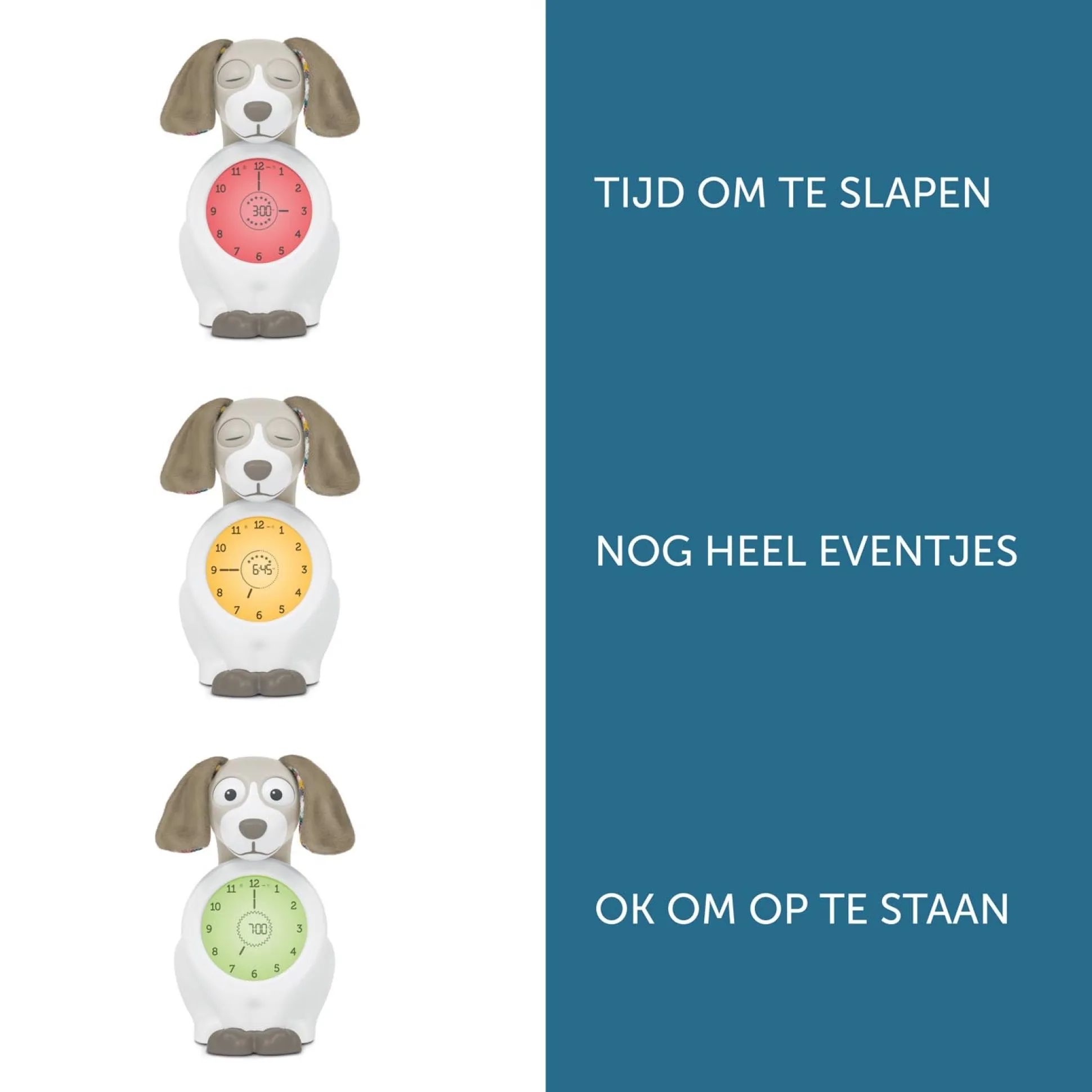 De Zazu slaaptrainer Davy helpt jouw kleintje wennen aan het tijdsbesef van ‘grote mensen’. Op een eenvoudige manier laat Davy de hond zien wanneer jouw kleintje uit bed mag. Hoe werkt de slaaptrainer? Davy gaat slapen wanneer jouw kindje ook gaat slapen, hij sluit zijn ogen en het scherm op zijn buik wordt donker. Een halfuur voordat Davy wakker wordt veranderd het scherm op zijn buik en zullen de 12 sterretjes 1 voor 1 verdwijnen, en zo de 30 minuten aftellen. Zodra je kindje uit bed mag, opent Davy zijn ogen, het scherm kleurt wit er er verschijnt een zon. Het tijdstip waarom dit gebeurt kan zelf ingesteld worden en maakt geen geluid. Davy heeft daarnaast twee tijdsinstellingen (handig voor het middagslaapje!) Het LCD scherm kan ook de gehele nacht blijven branden als nachtlampje. De Zazu slaaptrainer Davy werkt zowel op een adaptor (meegeleverde USB kabel) en batterijen (niet meegeleverd). Kleur: grijs. Afmetingen: 20x13x11cm