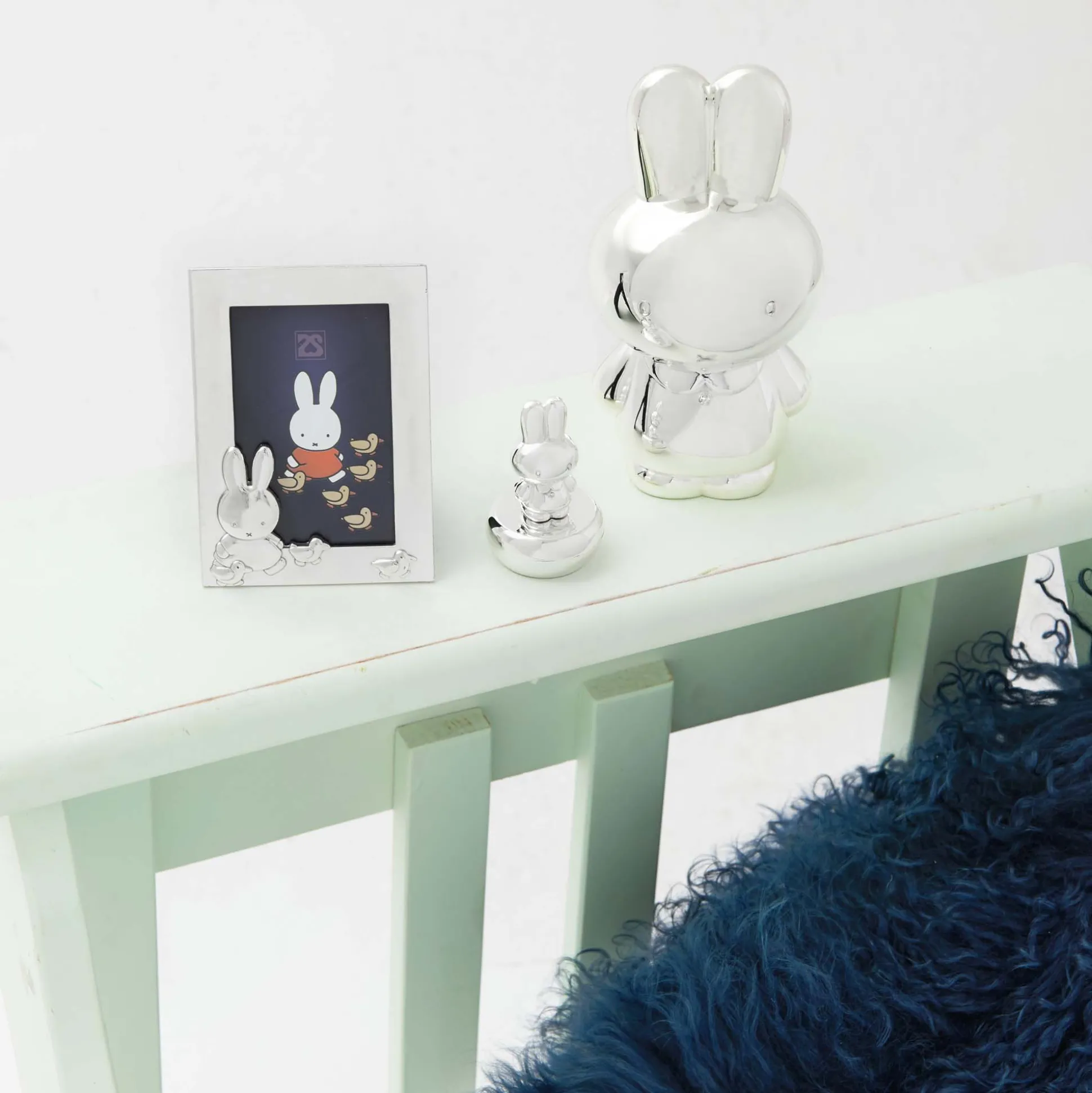 Zilverstad tanden- of haarlokdoosje met het beroemde konijn nijntje op de deksel. De binnenzijde is bekleed met blauw velours. Dit doosje is verzilverd en kan gegraveerd worden bij een juwelier, dit maakt het een persoonlijk geschenk. Doordat het verzilverd en gelakt is, is poetsen overbodig en blijft het tandendoosje lang mooi. Leuk om cadeau te geven of te krijgen. Afmetingen: 3,9 x 3,9 x 5,9 cm. In kleurrijke geschenkverpakking.